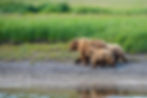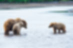 The end of our journey would conclude with a wonderful family of three. These two cubs were younger than my favorite awkward youngster, only one-year-olds. When first we met, they wrestled about by the riverbed. Their mother waded into the river and prompted plopped down on her belly, letting the glacial waters cool her off. The cubs swiftly followed her in, eager to play in the river.